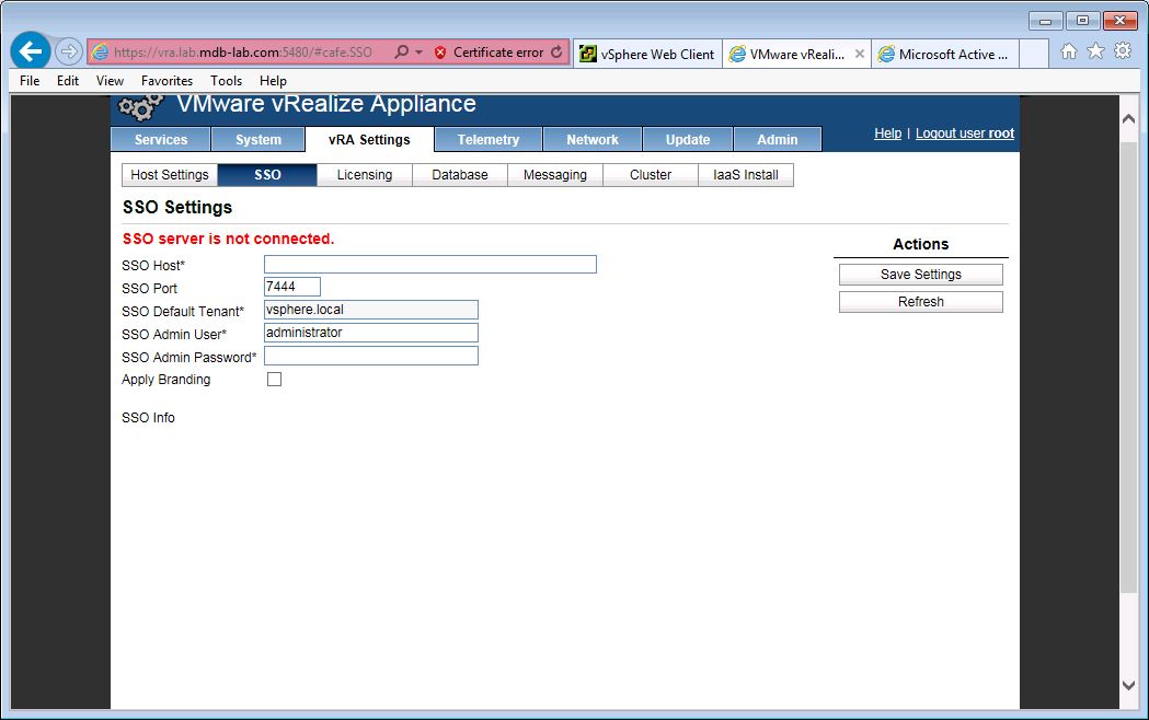 Logon using root and the password you set earlier. Once authenticated click on the vRA Settings tab: