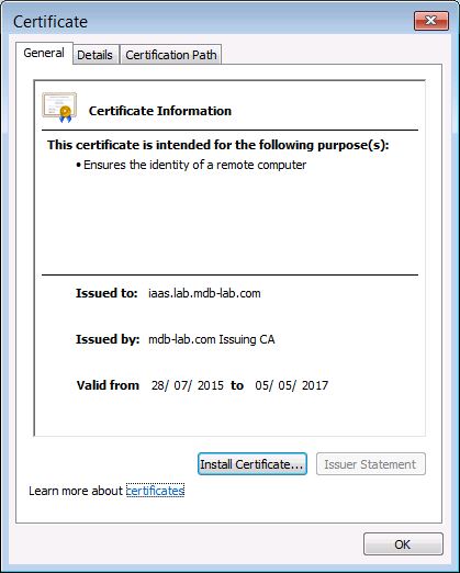 Verify the new certificate is in place by opening a web browser and navigating to https://iaas.lab.mdb-lab.com/vcac. You will receive a 401 error, but that can be ignored.