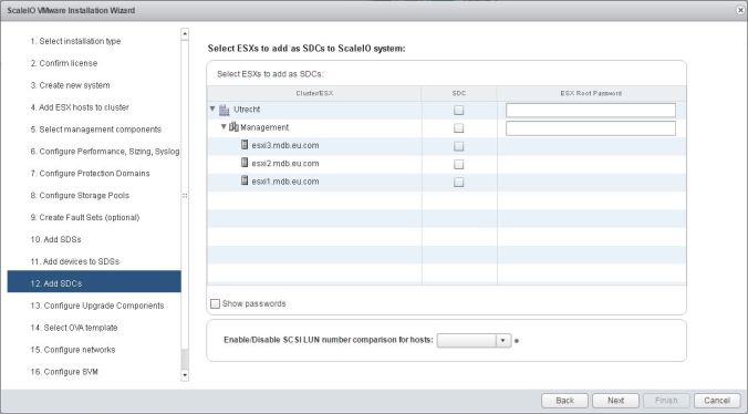 Select the hosts you wish to install the SDC onto. For each one, type the root passwords in the boxes provided, followed by Install: