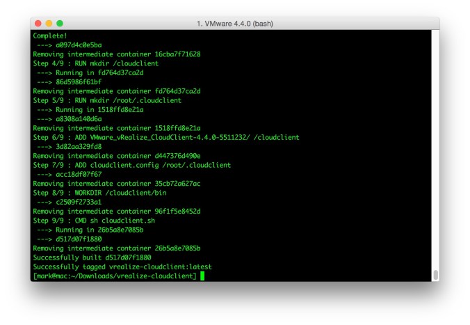 Create a folder on your workstation that has Docker installed. Download the latest version of CloudClient (at the time of writing this is version 4.4.0, and can be downloaded from https://my.vmware.com/web/vmware/details?downloadGroup=CLOUDCLIENT_440&productId=624) and unzip to the newly created folder.