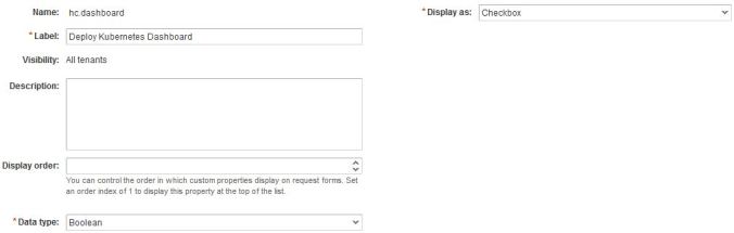 The first job is to define a custom property to enable the requester to decide if they’d like to deploy the Kubernetes Dashboard with their cluster deployment.