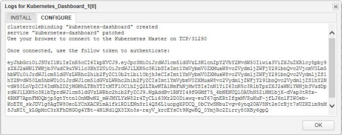 Deploy the blueprint from the service catalog. Once it has finished, select the request and find the step regarding the Kubernetes Dashboard. Click on the Configure tab to get the details: