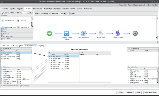 Drag the final component, another scriptable task onto the canvass. Call it Submit request, and map inClusterName and the following attributes: