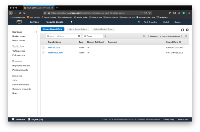 Login into the AWS Console and navigate to Route 53. In the following screenshot you can see I have two hosted zones:
