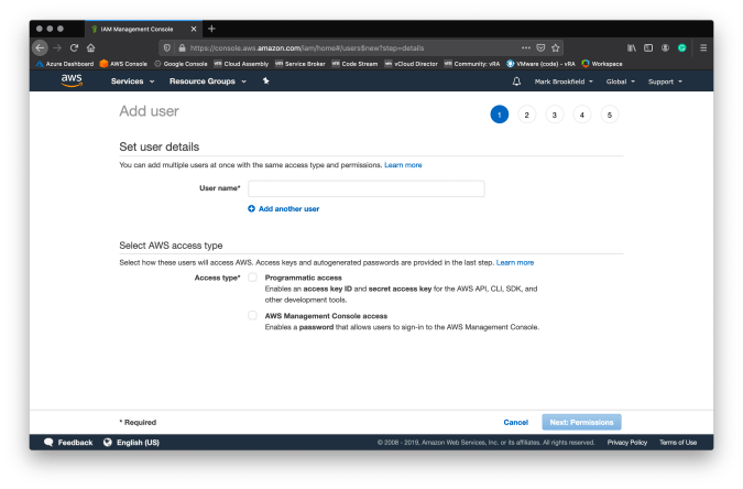 Navigate to the AWS IAM and select Users, then click Add User. Give the user a name, select Programmatic access and then click Next