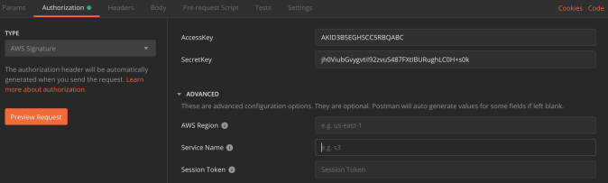 Change the Type to AWS Signature, and enter your Access Key and Secret Key: