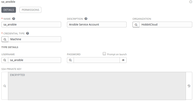 Navigate to Credentials and create a new one. Give it a name, select your organization, and set the Credential Type to Machine. Specify the username (from the code above) and paste in your SSH private key: