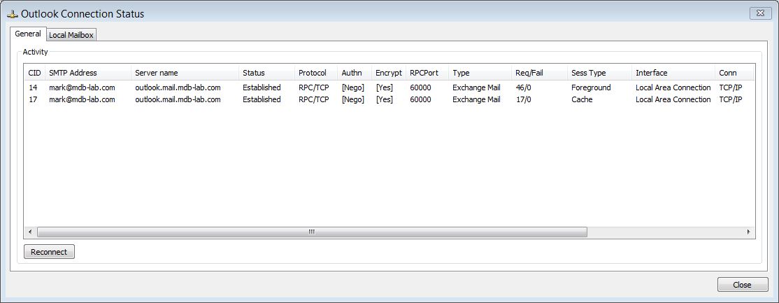 Finally, configure Outlook and connect to Exchange. The connection status should box should show a connection to the RPC port configured previously:
