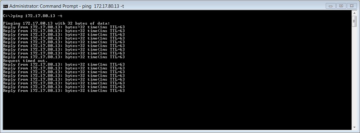 To test failover, I setup a looping ping from another host on VLAN80 to each cluster address and then suspended the HA1 VM. Each cluster IP failed over immediately to HA2, dropping only one ping in the process: